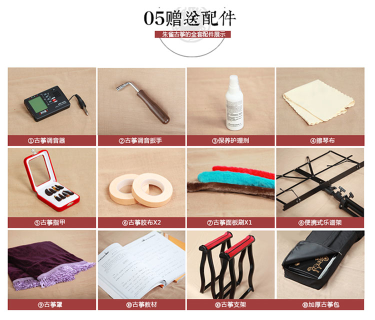 【优惠】朱雀古筝特惠全面升级,门店品鉴更多优惠惊喜。 【特点】朱雀05型古筝,系列经典款式,工艺精湛经久耐用其优美音色和多年不衰的稳定性能,可充分体现音乐的感染力。  【服务】送货上门,终身免费换弦,赠送古筝全套配件。 商品型号:05型 市场价格:0 优惠价格:0
