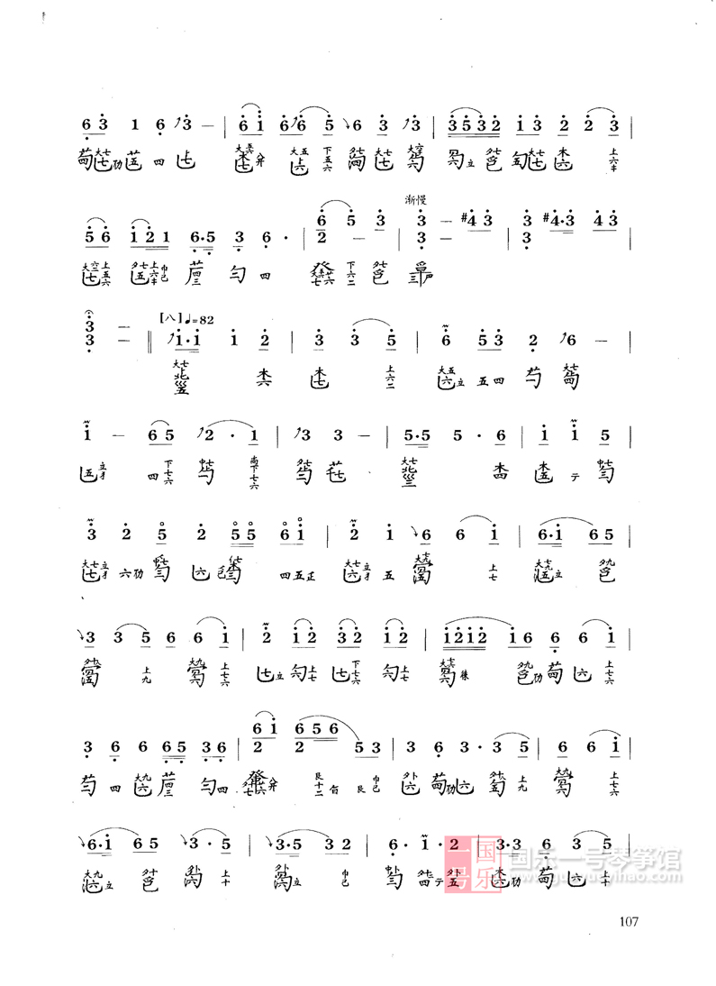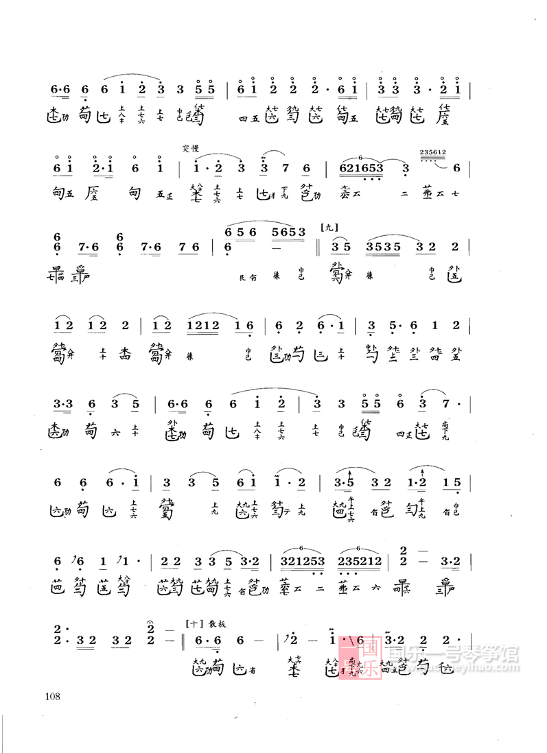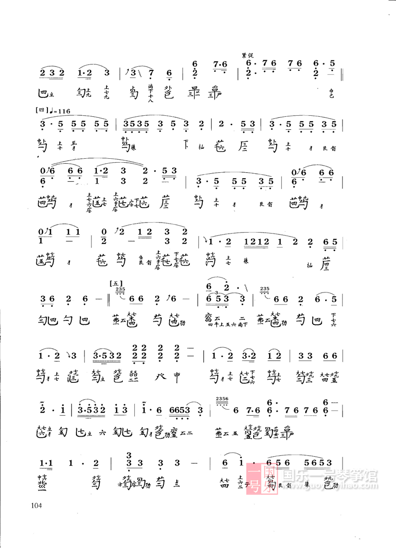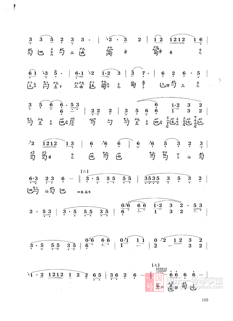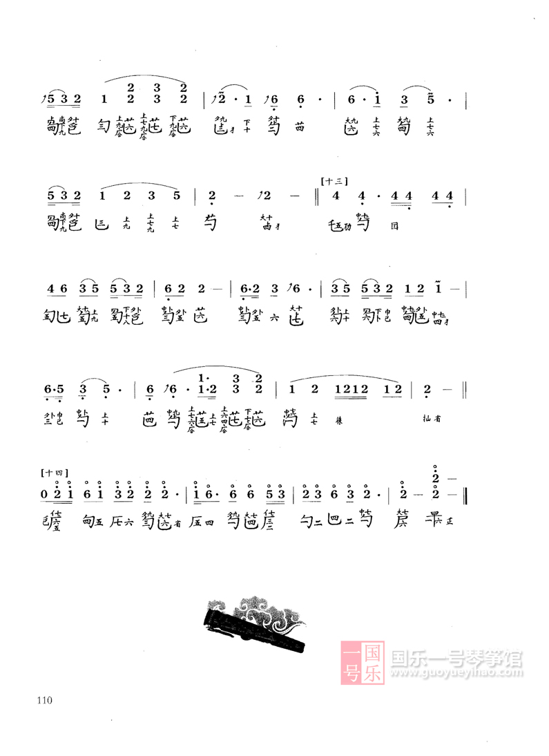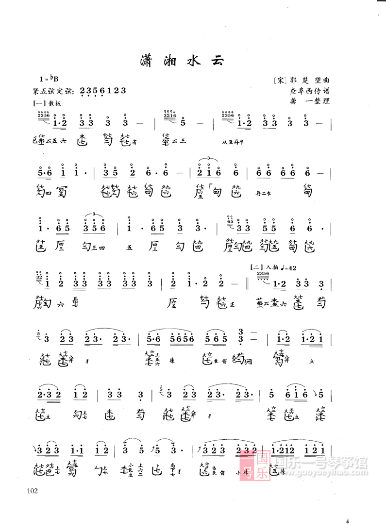 曲谱最初见于《神奇秘谱》,共分十段:1、洞庭烟雨2、江汉舒清3、天光云影4、水接天隅5、浪卷云飞6、风起云涌7、水天一碧8、寒江月冷9、万里澄波10、影涵万象。此曲流传至后世,有多种谱本,此版本是郭楚望曲,网结构也有一些变化。现流行的是十八段曲加一尾声。